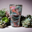 This cup has purple, pink, and teal. It has gold chunky glitter.